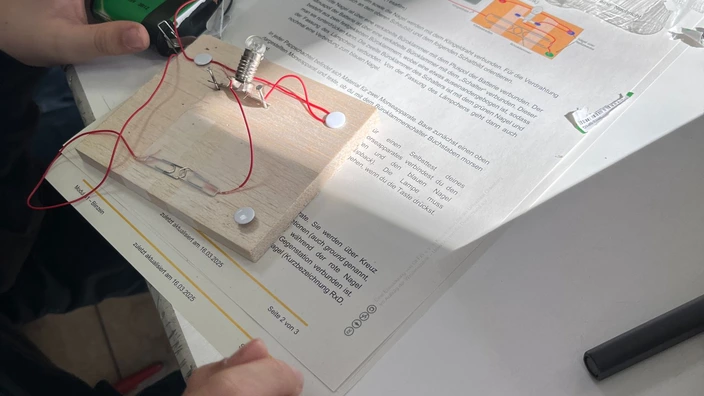 Unser Besuch der Ardagh Group hat zudem in zwei Unterrichtseinheiten praktische Experimente begleitet. In der ersten Einheit bauten die Schüler*innen der 6. Klasse mit den Materialien des IT2School-Moduls B1 aus Draht, Reißzwecken und Büroklammern einen Morseapparat.