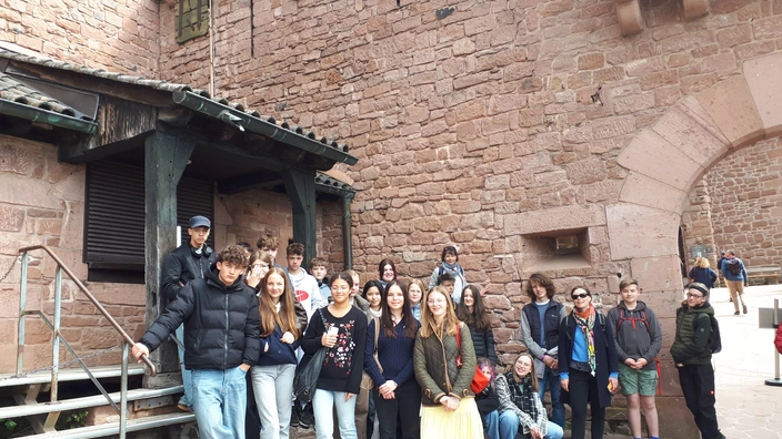Um zu der Burg zu gelangen, mussten wir mit einem Bus eine sehr kurvige und steile Strecke fahren, da die Burg auf dem höchsten Gipfel dort liegt. Um 11:00 Uhr sind wir angekommen. Vorort wurden wir von einem Tourguide auf Französisch durch das Schloss geführt und haben anhand des Burgmodells erstmal besprochen, warum man so eine Burg genau an dieser Stelle errichtet hatte. Danach haben wir den Innenhof angeguckt, wo sich die Mühle und die Schmiede befanden. Die Bewohner des Schlosses haben im Mittelalter in der Burg gelebt und alles, was sie brauchten, selbst hergestellt. Als nächstes haben wir den Wohnbereich des Schlossbesitzers besichtigt. Hier waren alle Möbel aus Holz und in jedem Raum waren beeindruckende Keramikkachelöfen. Als letztes waren wir noch in der Waffenkammer, wo wir jede Waffe genau erklärt bekommen haben. Die Tour wurde dann im oberen Innenhof beendet und wir haben uns noch kurz die Kanonen angesehen, die im oberen Teil der Burg ausgestellt waren. Am Ende haben wir noch alle zusammen auf der Burg gepicknickt und konnten noch tolle Fotos von der wunderschönen Aussicht machen. Insgesamt hat uns allen der Ausflug sehr gefallen und sogar unser Französisch Verständnis verbessert.