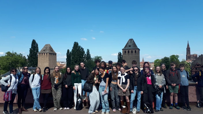 Auf unserer Reise nach Strasbourg durften wir nicht nur Französisch sprechen, sondern hatten auch die Gelegenheit uns durch die elsässische Küche durchzuprobieren. Ein absoluter Klassiker ist der Flammkuchen (französisch: tarte flambée). Der dünne Teig wird traditionell mit Crème fraîche, Zwiebeln und Speck belegt und im Holzofen knusprig gebacken. Wir waren überrascht wie lecker so ein elsässischer Flammkuchen schmeckt und wie viele Varianten es davon gibt, z.B. mit Käse oder sogar süß mit Apfel und Zimt. Auch der Gugelhupf, ein Hefekuchen mit Rosinen, Mandeln und manchmal einem Schuss Rum, gehört traditionell in die elsässische Backstube. Die besondere Gugelhupfform war in vielen Schaufenstern der „boulangeries“ (Bäckereien) zu sehen. Während unserer Stadtbesichtigungstour kamen wir an einem Eisgeschäft vorbei, das rosenförmiges Eis mit „Macarons“ drauf verkaufte - sehr lecker. Beim Picknick in der Burg, nahmen wir für alle Baguettes mit um, uns diese DIY-mäßig zu belegen. Es war zwar eine Herausforderung, den Belag sowie die 15 Baguettes auf die Burg zu bekommen, aber es hatte sich gelohnt. Wir speisten gut!